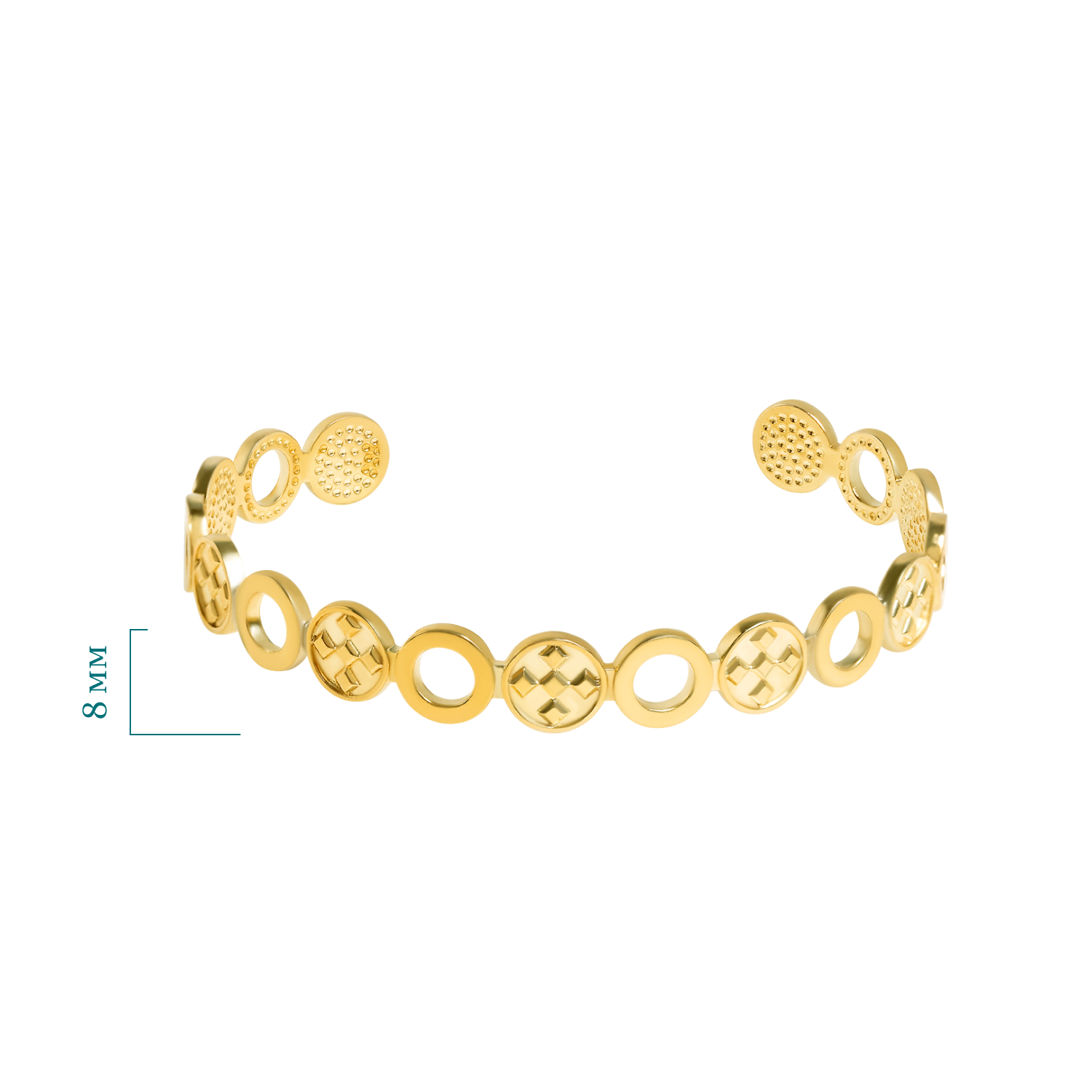 Описание: Стильный и лаконичный браслет в этно-стиле идеально дополнит любой образ. Браслет имеет форму незамкнутого круга, поэтому удобно сидит на руке и не сдавливает запястье. Основу украшения составляют круглые элементы с красивым орнаментом в виде пяти глаз – древнего символа защиты. Ювелирная бронза, из которой изготовлен браслет, обладает тёплым золотистым оттенком, создающим ощущение роскоши и благородства, при этом оставаясь более доступной альтернативой золоту. Металл отличается прочностью и устойчивостью к износу, а также со временем приобретает лёгкую благородную патину, который придает украшению особый шарм и уникальность. Ширина браслета составляет 8 мм, что делает его аккуратным, но заметным акцентом в образе, способным подчеркнуть, как повседневный стиль, так и офисный или вечерний наряд. Такой аксессуар подойдет тем, кто ценит украшения с характером и историей, ищет способы выразить свою индивидуальность и привнести в образ нотку загадочности и культурного наследия.