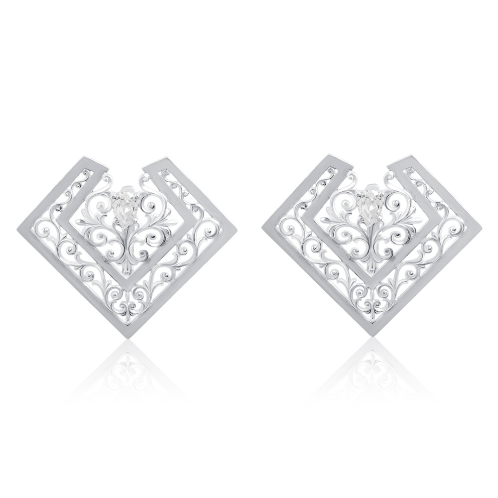 Описание: Крупные серебряные серьги геометрической формы – стильное решение для эффектных девушек. Украшение имеет форму ромба, благодаря своей форме и орнаментам, серьги смотрятся оригинально и эффектно. Прекрасным дополнением являются фианиты, которые добавляют изделию блеска и яркости. Украшение полностью декорировано орнаментами растительного направления – стебельками и завитками. Благодаря им, серьги кажутся лёгкими и нежными. Серебряные серьги сочетаются с любым образом: их можно носить на работу со строгим костюмом, на прогулку с джинсами и рубашкой, на свидание или на семейное торжество.