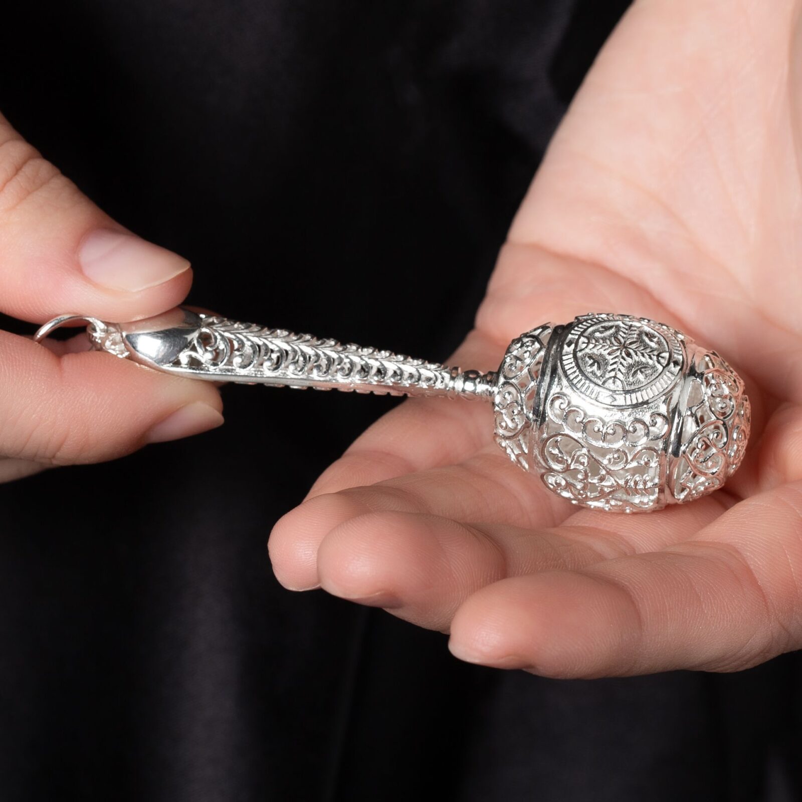 Описание: Серебряная погремушка от ювелирной компании УРУУ – восхитительный подарок ребёнку на крещение, на 1 годик, первый зубик или на другое памятное событие. Погремушка выполнена из высококачественного серебра 925 пробы, размер изделия небольшой: длина 9 см, ширина 2,5 см. Серебро обладает антисептическими свойствами и не вызывает аллергии. Кроме того, этот металл защищает от злых сил и негативной энергии. Ручка удобная, идеально подходит для детской ладони, потому её комфортно держать и играть им. На верхней части погремушки изображён оберег «Шип шиповника», который предназначен для защиты детей. Внутри погремушки находится серебряный шар, который приятно звенит при встряхивании. По якутским поверьям, звон серебра отпугивает демонов и злых духов. Поэтому такая игрушка будет лучшим и полезным подарком для маленького человека. Подарив серебряную погремушку, вы подарите малышу не только красивую игрушку, но и надёжную защиту.