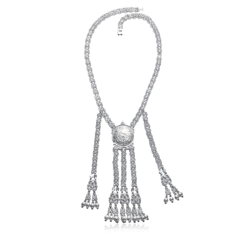 Описание: Якутское нагрудное украшение изготовлено из серебра 925 пробы. Современный дизайн украшения позволяет сочетать его с любой одеждой – будь это традиционный якутский наряд или классическое вечернее платье. Цепочка прочная, состоит их небольших деталей в форме лиры. Лировидный узор считается символом плодородия, благополучия, роста и благословляет к светлой и прекрасной жизни. В центре изделия на уровне груди находится элемент солнца. Символ солнца означает «жизнь», «благоволитель удач, счастья», «хранитель, защитник». Сверху над солнцем поместился сердцеобразный орнамент, который является символом истинной любви, светлого будущего и развития.