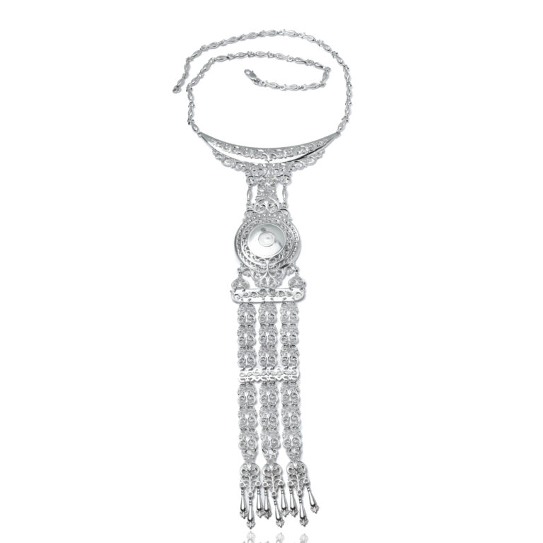 Описание: Якутское серебряное нагрудное украшение на цепочке. Способ застёжки – карабин. Этот вид замка надежный и прочный, может выдержать большой вес для ювелирного изделия. Цепочка состоит из маленьких деталей, напоминающих нераскрывшиеся цветы. Основа украшена орнаментами растительного мотива – вьющимися стебельками и завитками. В середине украшения изображен священный символ солнца. Солнце для якутян олицетворяет счастье и благополучие. Ниспадающие подвески изображены в форме лиры, внутри которой находится цветок лилия. Лилия даурская (Сардаана) - издревле почитаемый якутским народом цветок, символ красоты природы и долгожданного лета, счастья и благополучия.