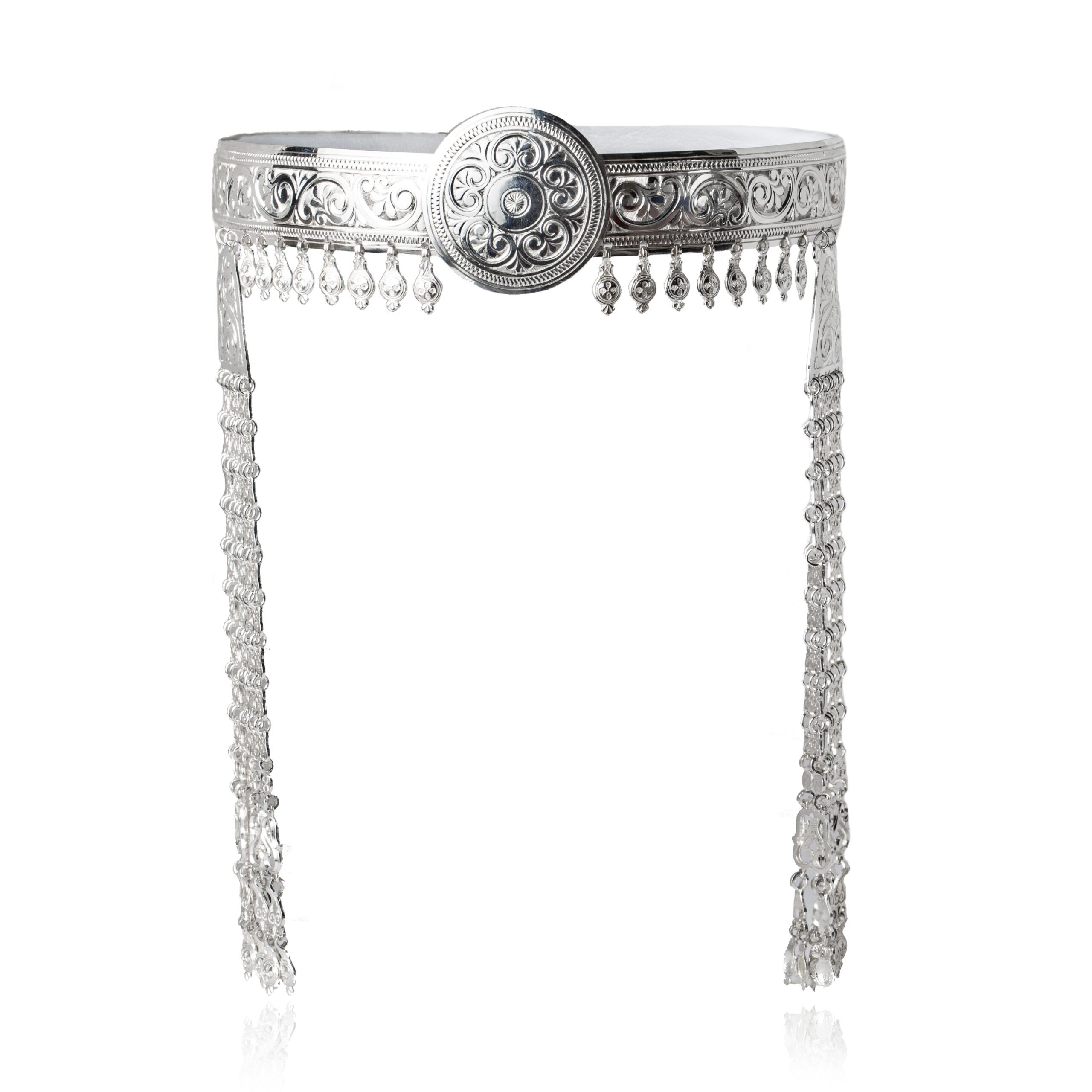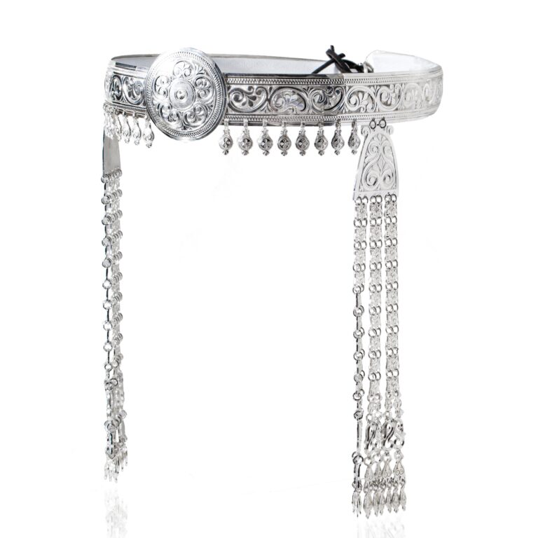 Описание: Головной убор «бастыҥа» изготовлен из благородного серебра 925 пробы. Классическое изделие имеет универсальный размер и регулируется с помощью шнурка. Серебряный обруч оформлен изящными растительными орнаментами с переплетающимися стеблями и завитками, а центральную часть головного украшения украшает узор «Солнце». Такие мотивы, сочетающие растительную символику и солярный знак, традиционно ассоциируются с плодородием, развитием и служат защитным символом для своей владелицы. Цепочки-подвески дополнены изображениями оберега от сглаза. Ручная гравировка подчёркивает премиальность изделия, а игра света на гранях узоров создаёт ощущение изысканности.