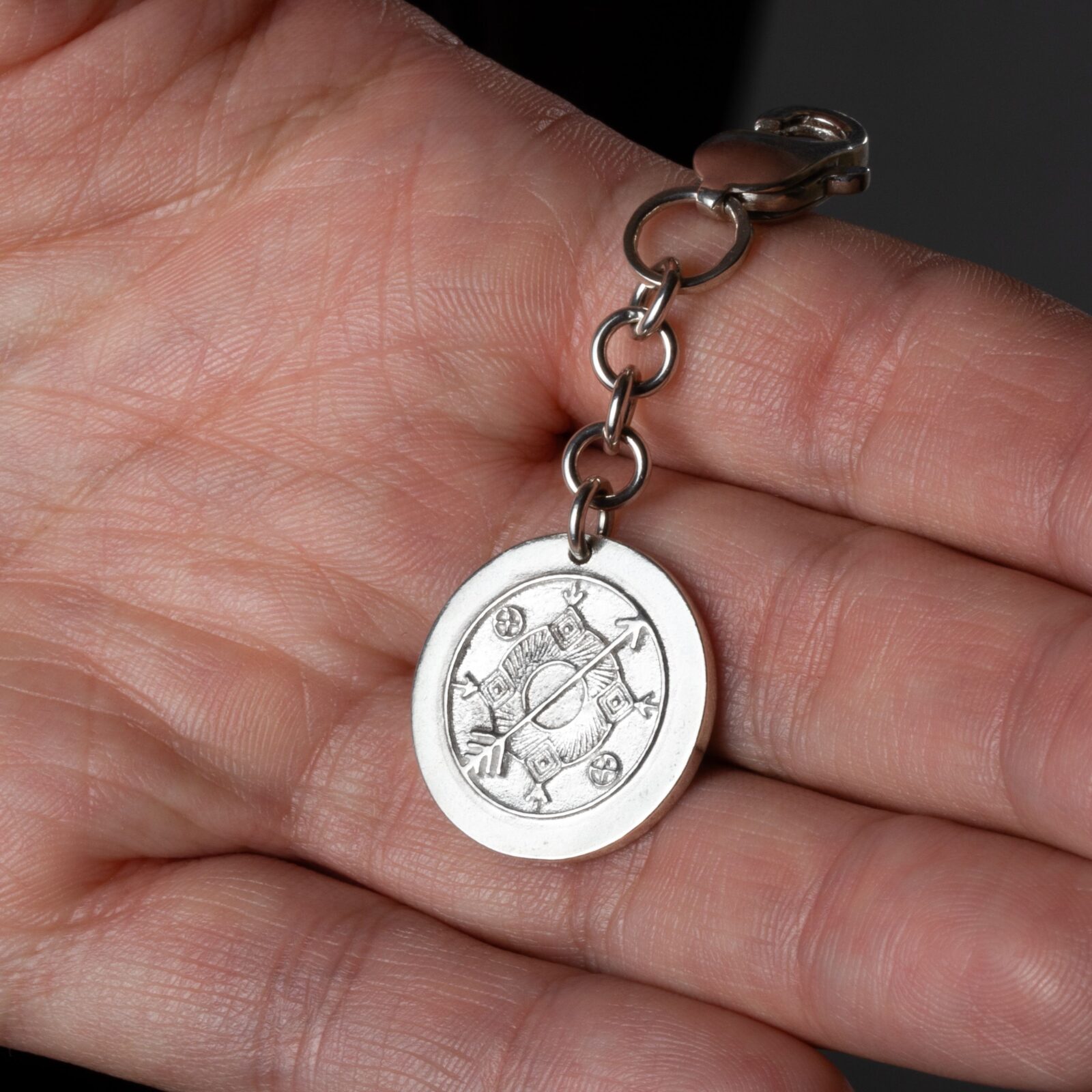 Описание: Серебряный брелок с оберегающим орнаментом и гравировкой станет надёжным и стильным аксессуаром для ваших ключей. Брелок изготовлен из высококачественного серебра 925 пробы, способ крепления – крепкий и надёжный карабин. Аксессуар двухсторонний – с одной стороны изображён оберегающий орнамент, с другой – мотивирующие слова. Изображённый на брелоке мужской оберег «Стрела» («Ох») дарует силу, мощь, смелость, волю к победе и удачу. Выгравированные на другой стороне брелока слова, переводятся как «Терпи! Побеждай! Достигай!». Серебряный брелок с оберегом и гравировкой подойдёт для подарка сыну, мужу, брату и отцу. Аксессуар из серебра станет приятным и надёжным подарком с глубоким смыслом.
