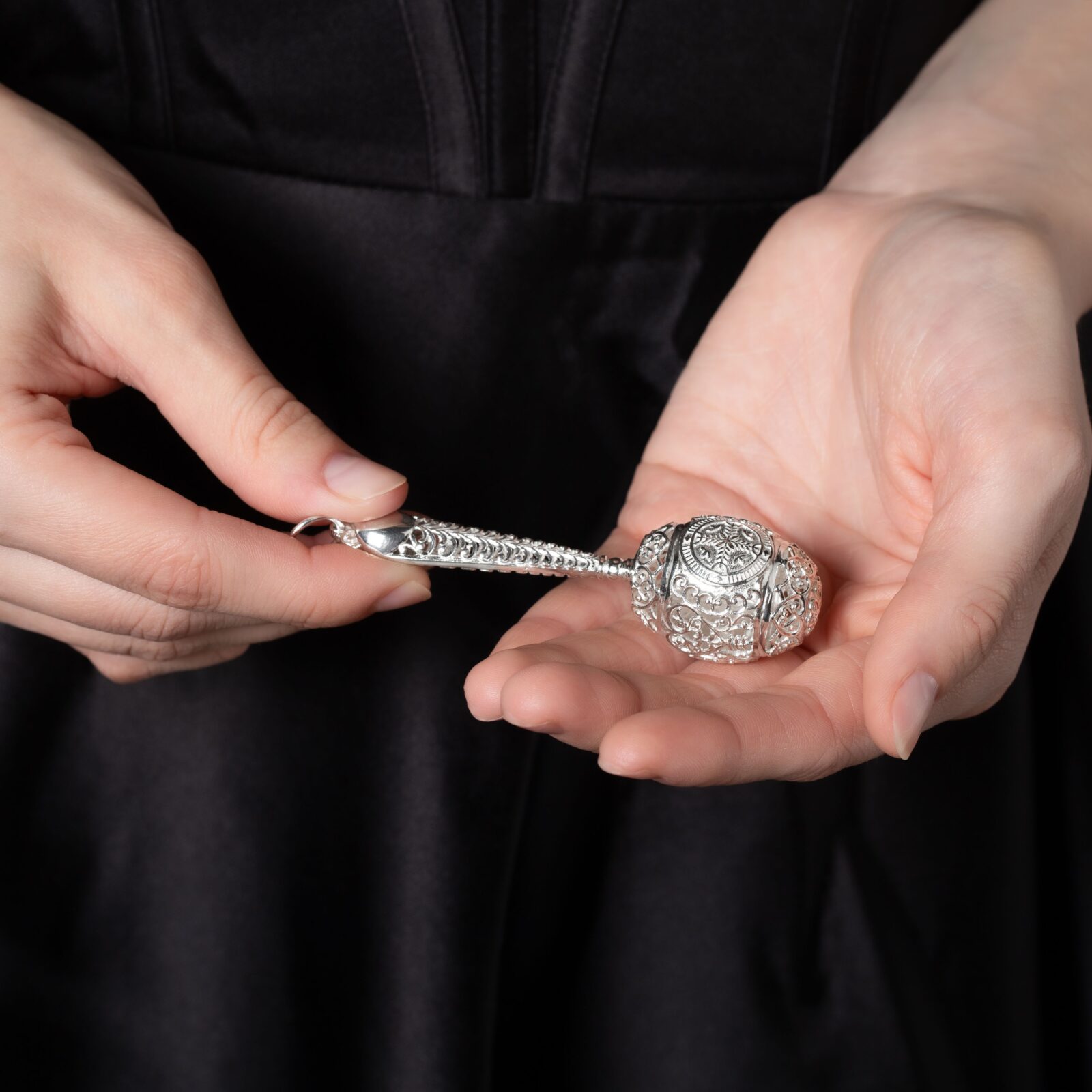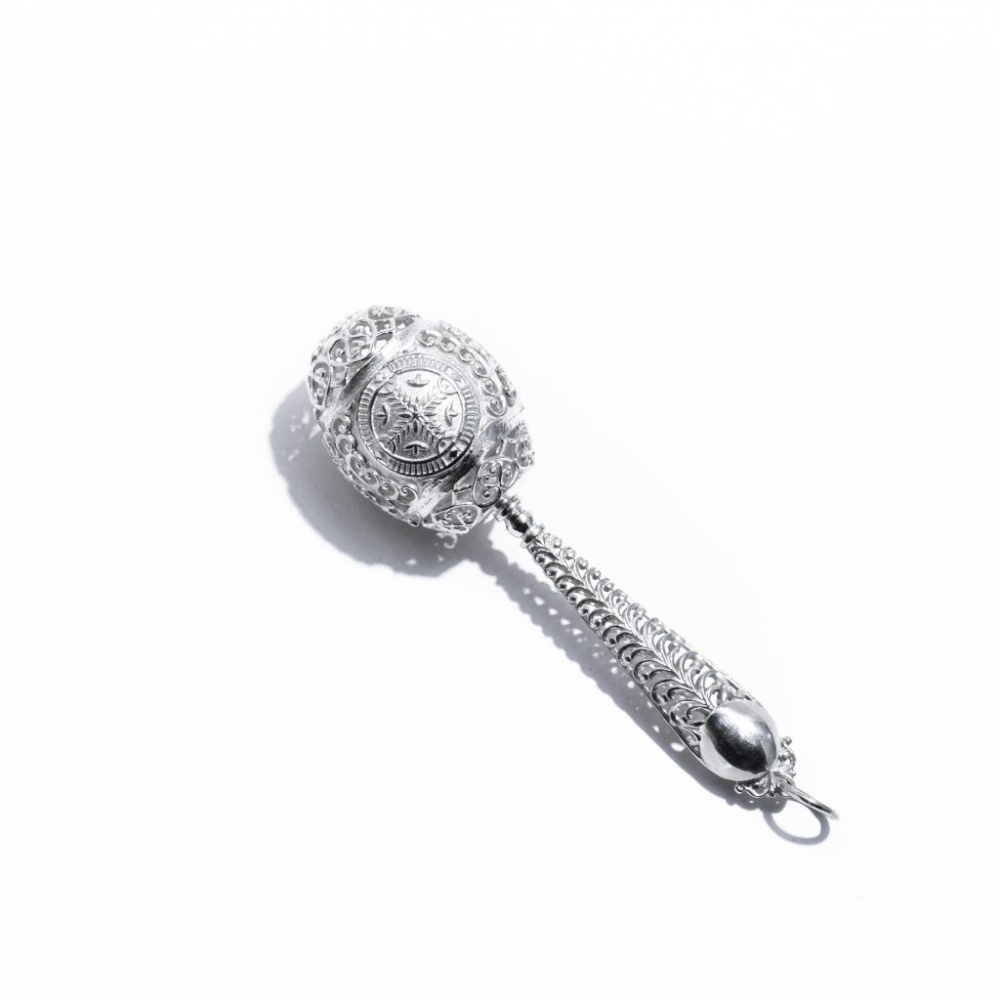 Описание: Серебряная погремушка от ювелирной компании УРУУ – восхитительный подарок ребёнку на крещение, на 1 годик, первый зубик или на другое памятное событие. Погремушка выполнена из высококачественного серебра 925 пробы, размер изделия небольшой: длина 9 см, ширина 2,5 см. Серебро обладает антисептическими свойствами и не вызывает аллергии. Кроме того, этот металл защищает от злых сил и негативной энергии. Ручка удобная, идеально подходит для детской ладони, потому её комфортно держать и играть им. На верхней части погремушки изображён оберег «Шип шиповника», который предназначен для защиты детей. Внутри погремушки находится серебряный шар, который приятно звенит при встряхивании. По якутским поверьям, звон серебра отпугивает демонов и злых духов. Поэтому такая игрушка будет лучшим и полезным подарком для маленького человека. Подарив серебряную погремушку, вы подарите малышу не только красивую игрушку, но и надёжную защиту.
