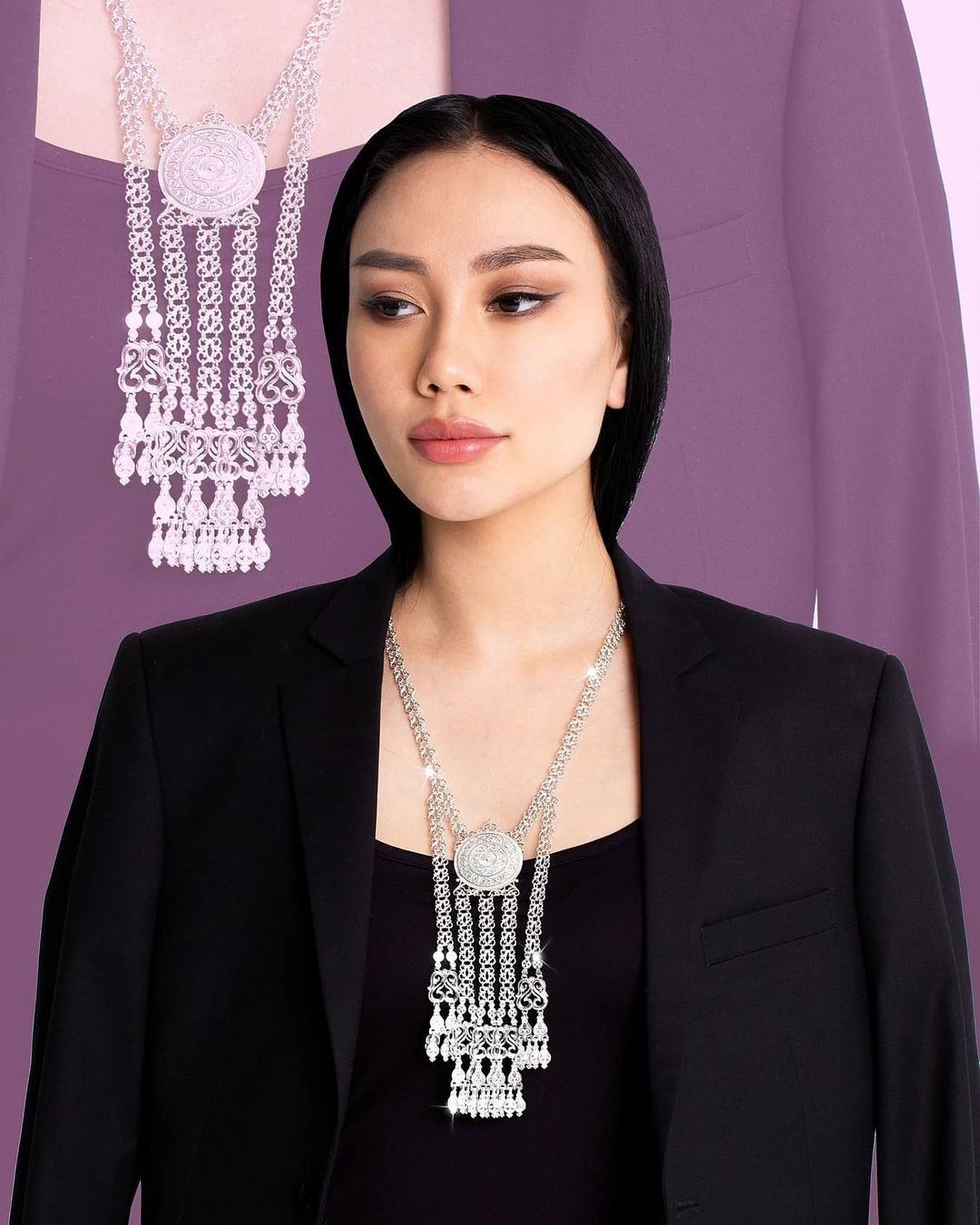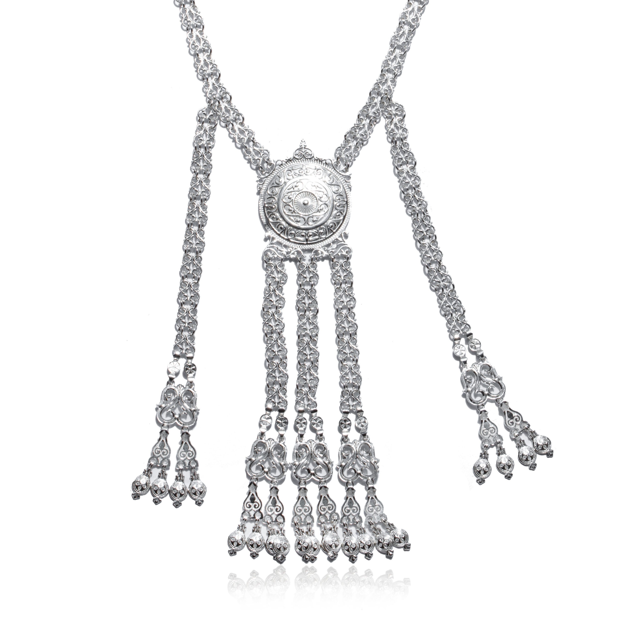 Описание: Якутское нагрудное украшение изготовлено из серебра 925 пробы. Современный дизайн украшения позволяет сочетать его с любой одеждой – будь это традиционный якутский наряд или классическое вечернее платье. Цепочка прочная, состоит их небольших деталей в форме лиры. Лировидный узор считается символом плодородия, благополучия, роста и благословляет к светлой и прекрасной жизни. В центре изделия на уровне груди находится элемент солнца. Символ солнца означает «жизнь», «благоволитель удач, счастья», «хранитель, защитник». Сверху над солнцем поместился сердцеобразный орнамент, который является символом истинной любви, светлого будущего и развития.