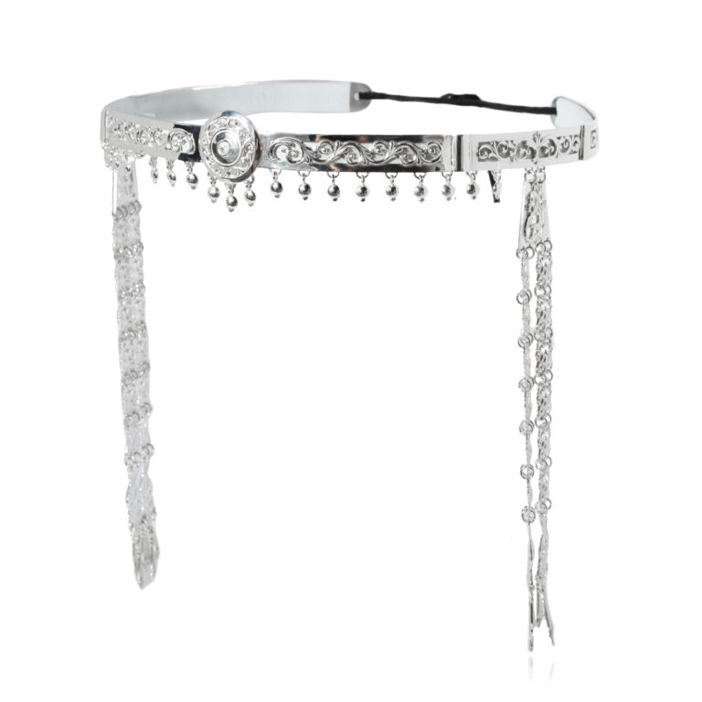 Описание: Головной убор «бастыҥа» выполнен из благородного серебра 925 пробы. Универсальный размер регулируется с помощью шнурка, что обеспечивает комфортную посадку. Серебряный обруч украшен изящными растительными орнаментами с переплетающимися стеблями и завитками, а в центре расположён узор «Солнце». Сочетание растительных мотивов и солярного символа традиционно ассоциируется с плодородием, обновлением и защитой для своей обладательницы. Цепочки-подвески оформлены изображениями оберега от сглаза. Ручная гравировка подчёркивает премиальность изделия, а игра света на гранях узоров придаёт ему утончённый блеск.