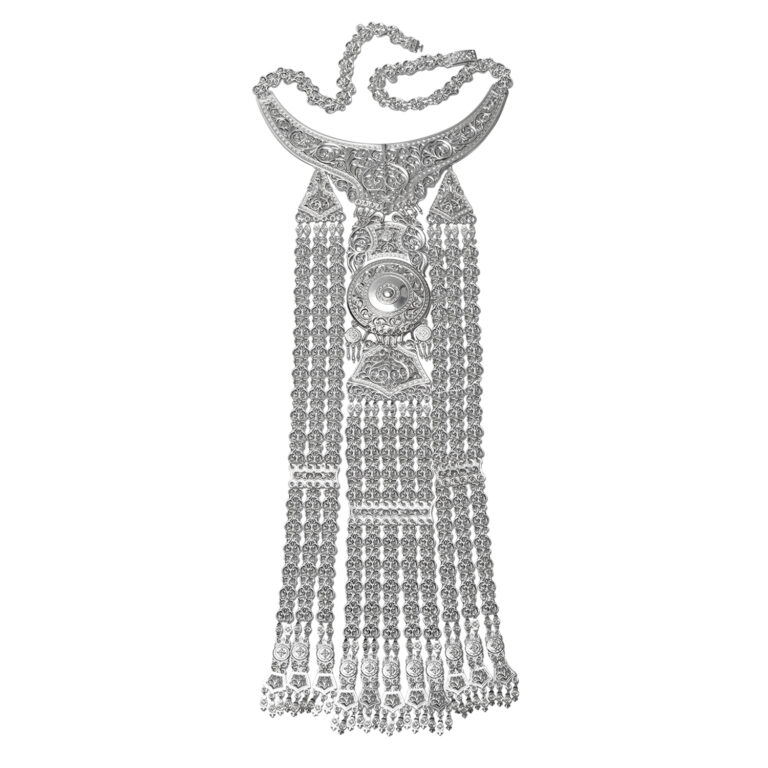 Описание: Традиционное нагрудное украшение “Илин кэбиһэр” изготовлено из серебра 925 пробы. Нагрудное украшение – трансформер 4 в 1. Приобретая одно изделие, вы получаете целых четыре: два вида колье для вечернего выхода и два варианта илин кэбиһэр. Серебряное изделие декорировано лировидным орнаментом, символизирующим древо жизни, плодородие и рост. Полностью украшен орнаментами растительного направления. В центре украшения поместился солярный диск “Күн”, который символизирует Солнце среднего мира и приносит счастье и благополучие.