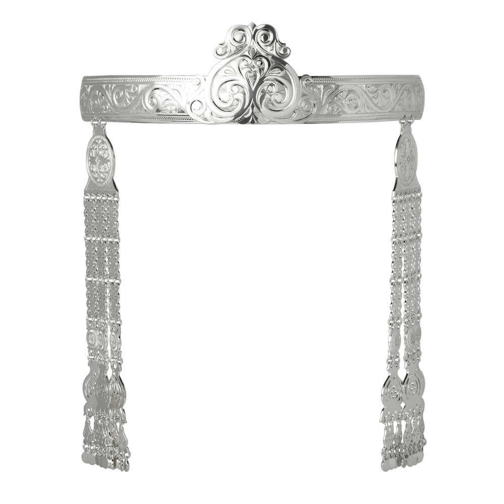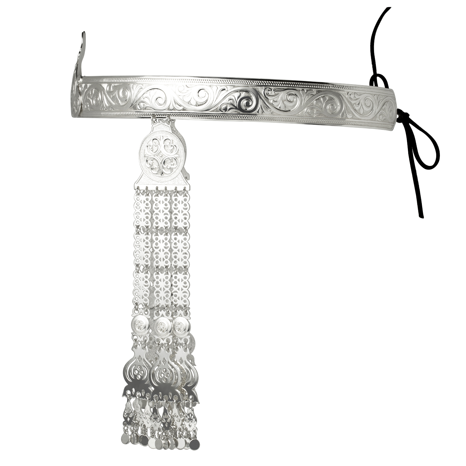Описание: Одно из главных украшений для дополнения образа якутской девушки - головной убор «Бастыҥа». Ювелирное изделие выполнено из благородного серебра 925 пробы, безразмерное, фиксируется с помощью шнурка. Серебряный обруч украшен вьющимися узорами в виде стеблей и завитков, центр головного убора декорирован лировидным орнаментом. Эти лировидные и растительные орнаменты символизируют плодородие и рост, призваны защищать и оберегать свою обладательницу. На цепочках-подвесках изображён оберег, защищающий от дурного глаза. Вручную выгравированные узоры придают изделию особую роскошь, а их переливающиеся грани создают атмосферу волшебства.