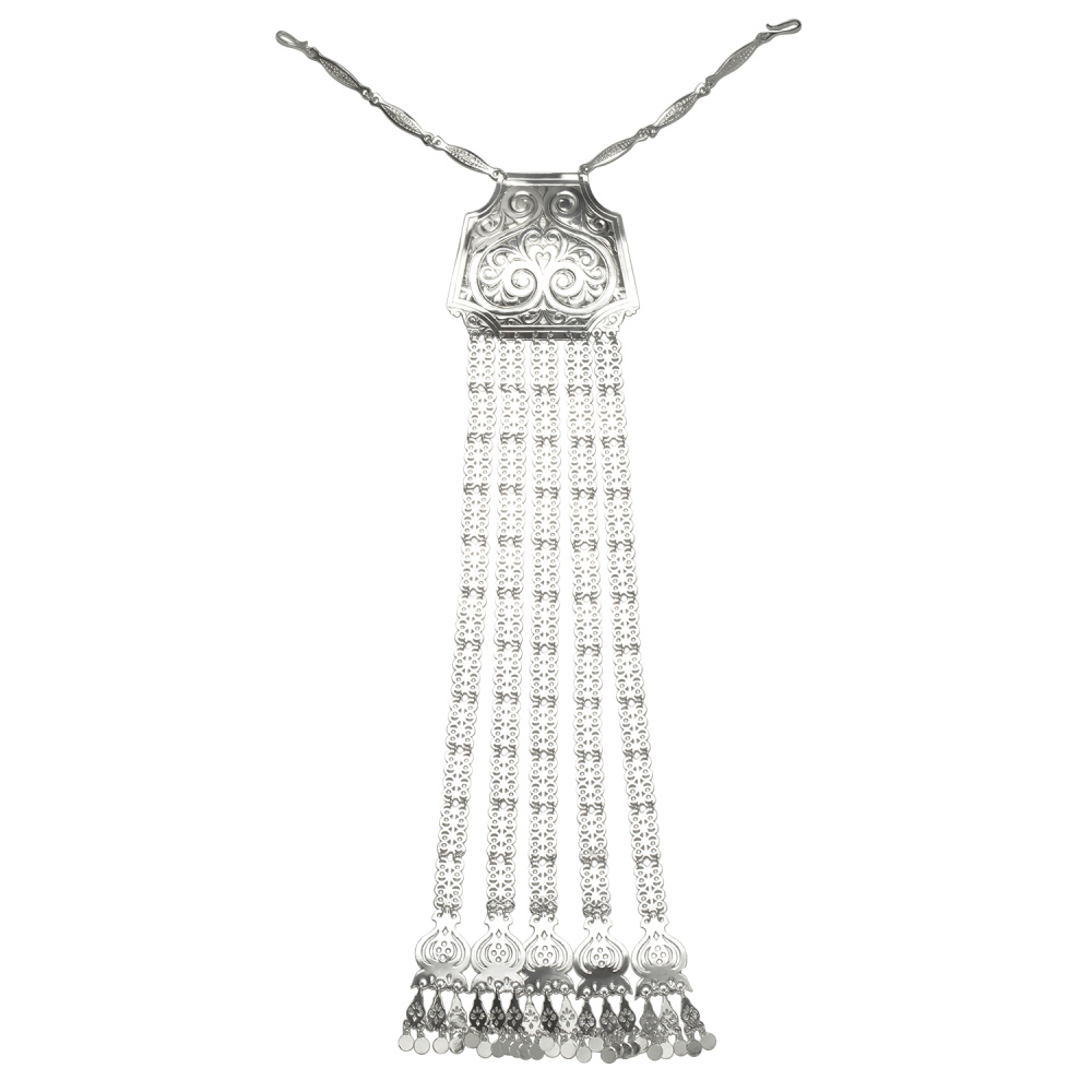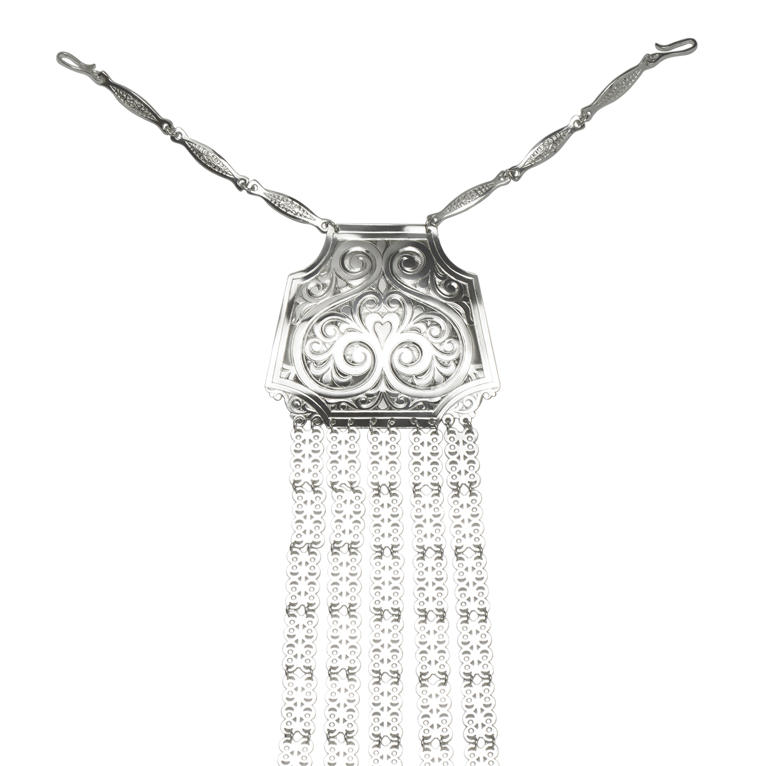 Описание: Наспинное украшение «Кэлин кэбиһэр» является идеальным дополнением к нагрудному украшению “Илин кэбиһэр”. Оно обеспечивает комфорт для шеи, предотвращая усталость при ношении массивного нагрудного изделия. Особое внимание привлекает ручная гравировка на серебряной пластинке, которая делает изделие уникальным. Переливающиеся грани орнаментов создают волшебный эффект, подчеркивая красоту серебра и мастерство ювелира. Выгравированные на украшении лировидные и растительные орнаменты, являются символами плодородия и роста, что придаёт украшению дополнительный смысл. Нагрудное украшение «Кэлин кэбиhэр» призван защитить свою обладательницу от влияния злых духов и привлечь к ней богатство, плодородие и здоровье.