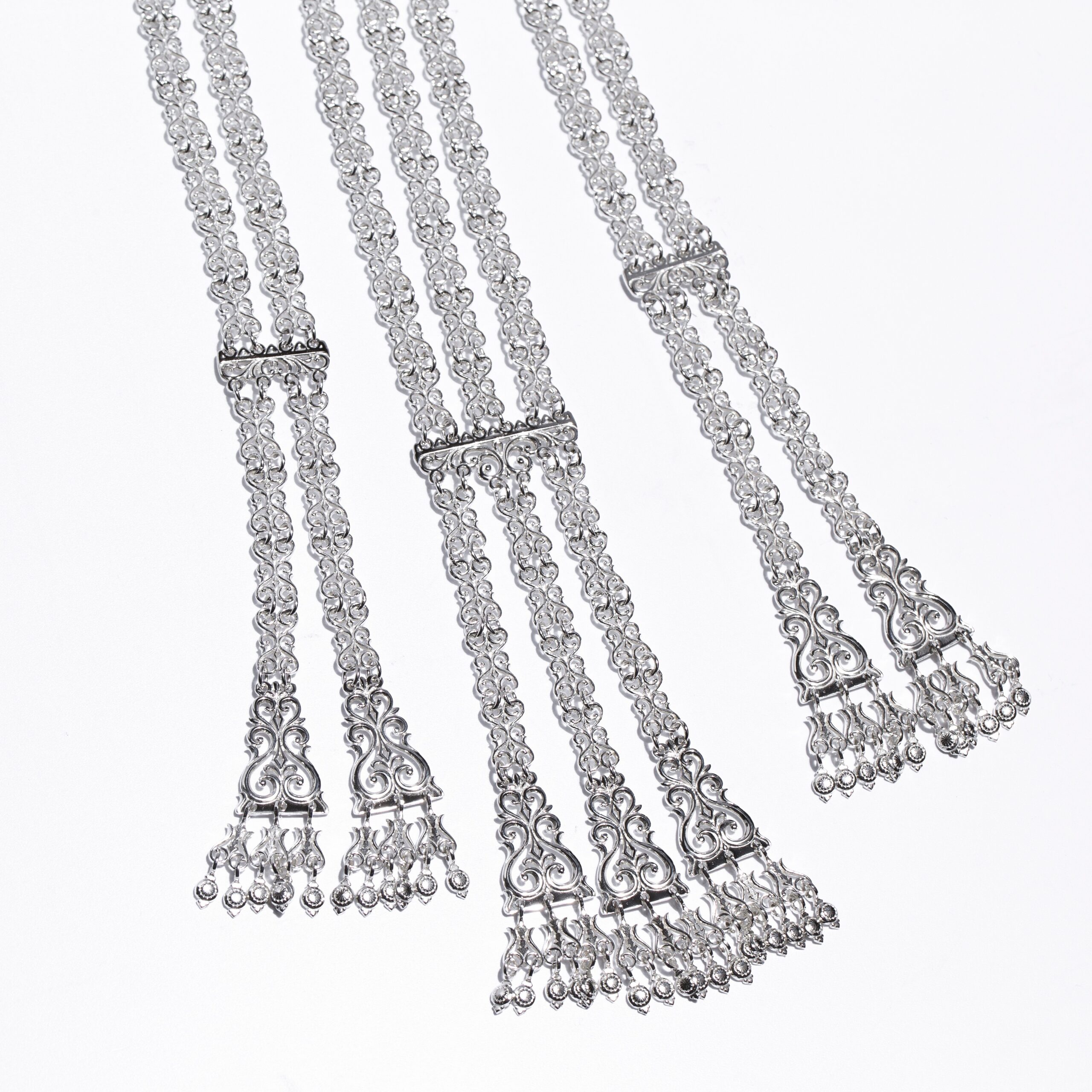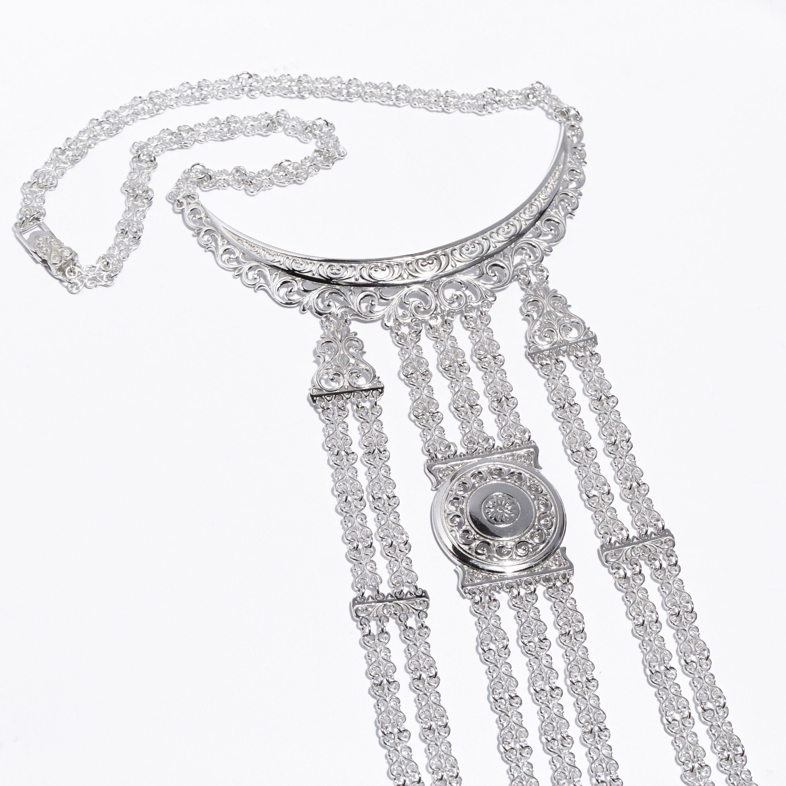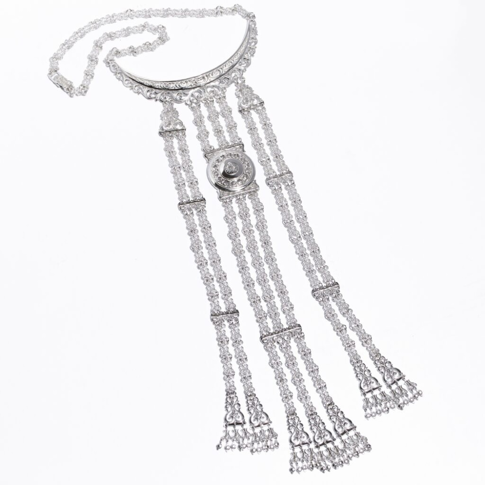 Описание: Женское традиционное нагрудное украшение выполнено из серебра 925 пробы. Плоская гривна инкрустирована объемными узорами в виде завитков. Из гривны в три ряда ниспадают серебряные цепочки, состоящие из подвесок в форме лиры. По центру между цепочками находится солярный диск «Күн», который символизирует солнце и олицетворяет счастье и благополучие. Центр круга украшен орнаментом в виде цветка. Украшение полностью состоит из деталей, декорированных лировидными орнаментами. Лировидный узор является главной темой растительного направления, он носит значение древа жизни, плодородия и роста. Нагрудное украшение из серебра дополнит ваш наряд и придаст образу завершённости.