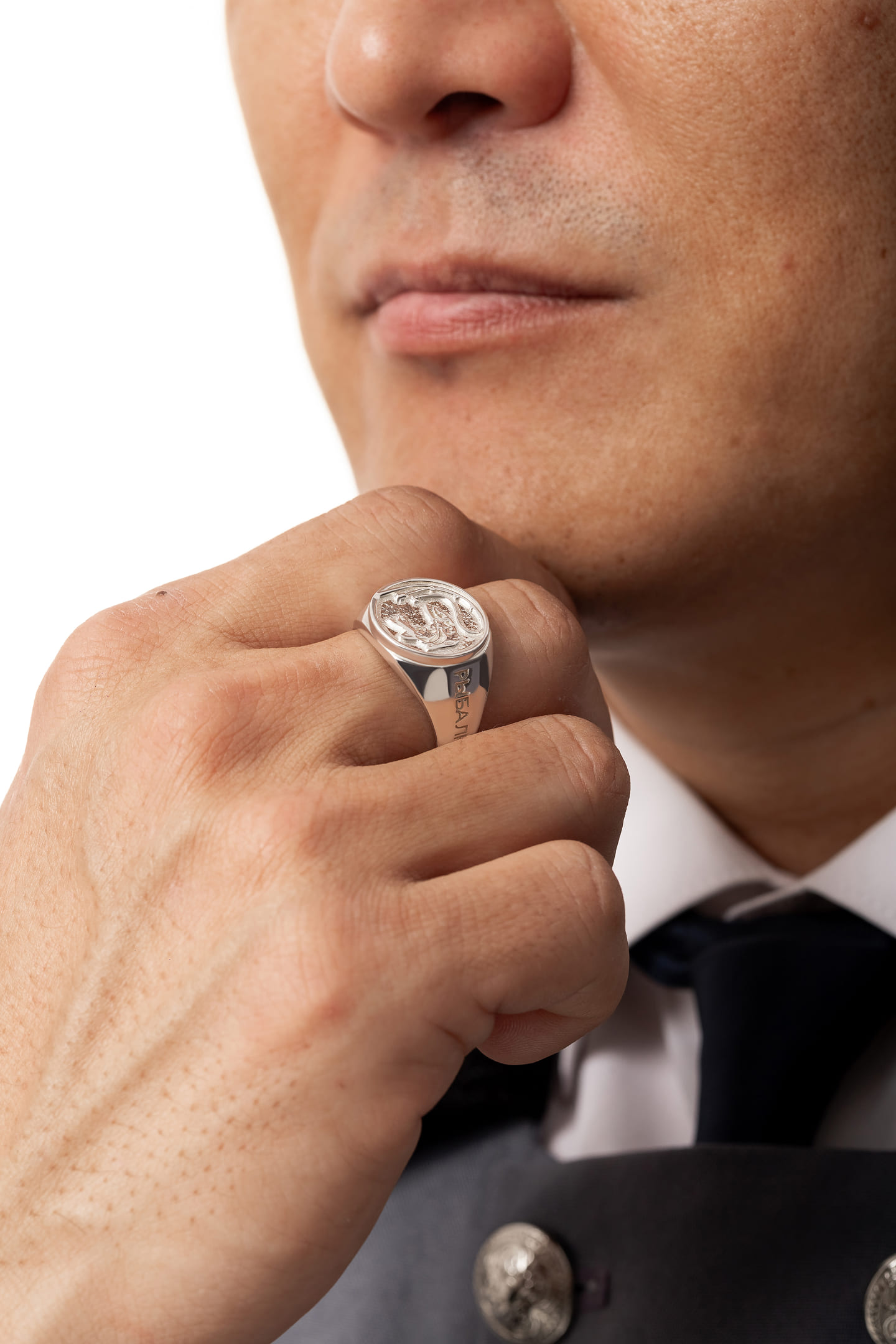 В её основе — серебряные блёсны, в которых рыбацкая эстетика переосмыслена через ювелирную форму, а также печатка с фирменным логотипом.